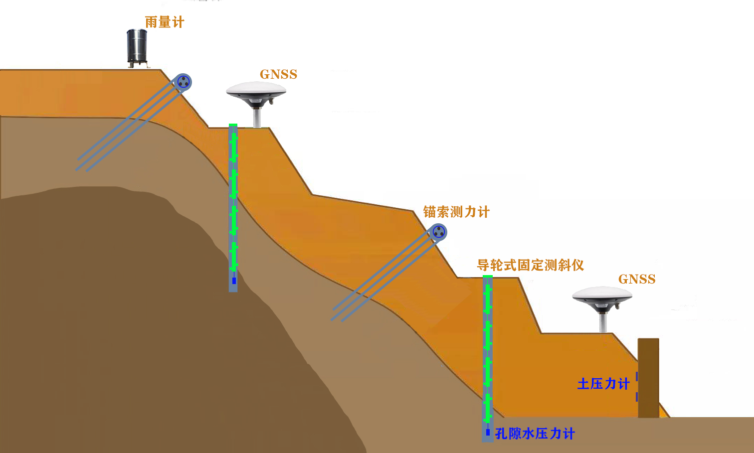 对于一些地质条件特殊的边坡,往往会增加锚索锚杆以及挡土墙等,以增加坡体的稳定性。锚杆是将拉力传至稳定岩土层的构件,当采用钢绞线或高强钢丝束作杆件材料时,也可称为锚索,在边坡崩塌或危岩体的锚固施工中,使用最多的是摩擦型灌浆锚杆。施工时钻孔的深度必须超过滑动面的埋深,并在稳定的岩土层中达到足够的有效锚固长度。为了解边坡的稳定性,需对挡土墙、锚杆锚索受力进行监测,挡土墙压力监测选用土压力计,锚索受力监测选用锚索计,锚杆应力监测选用钢筋计。